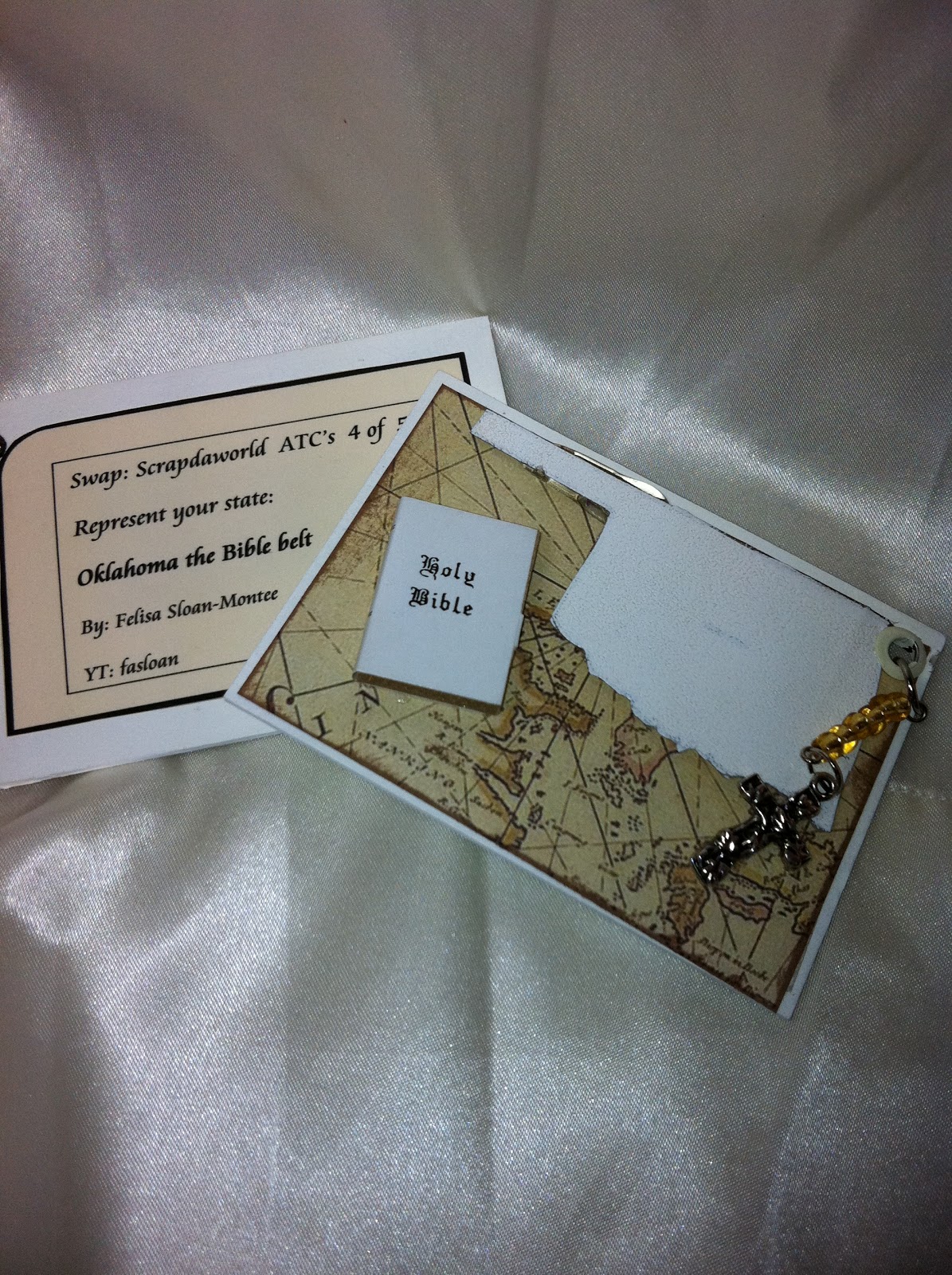 These are my ATC's for Tmika ~ Scrapdaworld. The theme is represent your state. I am from OKLAHOMA and we are known as the Bible Belt so I went to Hobby Lobby and got the bibles out of the miniature doll house section and printed a map of OKLA added some map paper in the background then I put a charm on the corner with a cross and I think I represented OKLA just fine :D